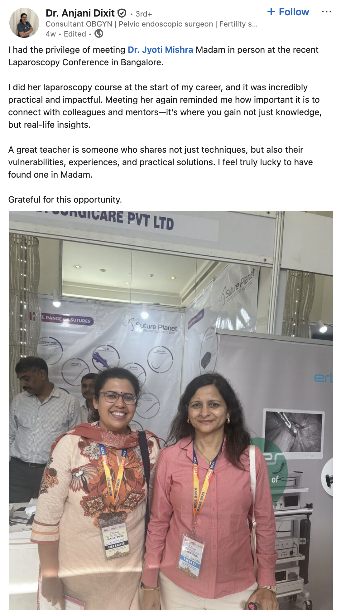 After completing the online course and clearing the exam, one can come for two days training. This will include live surgical experience in operation theatre & extensive training on pelvi trainers with direct supervision of mentor at a nominal fee.